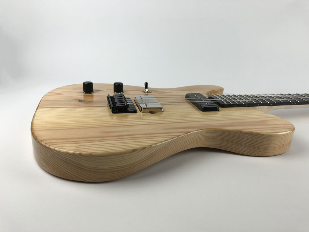 “Working with Carl was a delight. I was set on a pine guitar with P90 pick ups and, between us, we worked from there. Appearance is important so we settled on black hardware to set off the vintage pine and at Carl’s suggestion we opted for a RichLite fretboard. This rather appealed to me, the mix of antique wood with a very modern alternative to traditional fretboard materials. As it worked out, the RichLite makes a lovely smooth fretboard so sliding from one end of the fretboard to the other is a dream and very easy on the fingers, good call!” RichLite is an engineered product made from paper. It has some really cool benefits, such as being really stable, being impervious to humidity and temperature, it has similar tonal properties as ebony, and is eco-friendly.